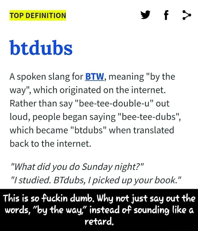 Bee Tee Dubs : (sort of like, in addition to.)